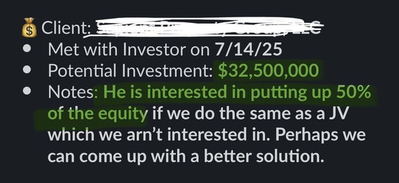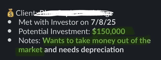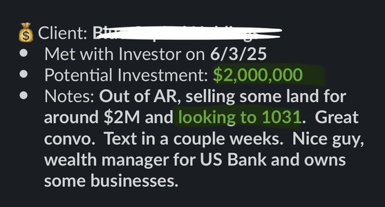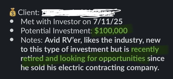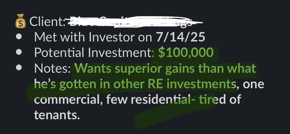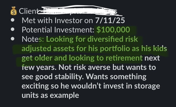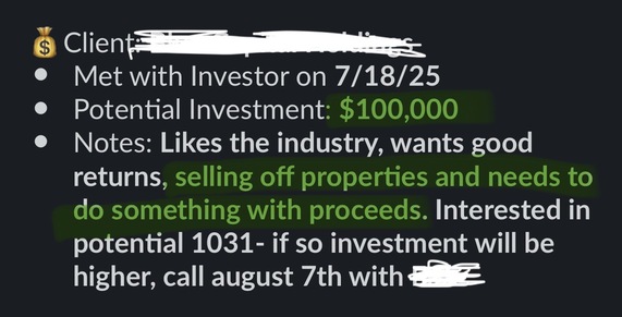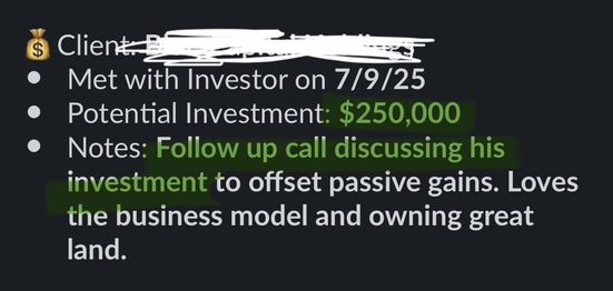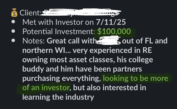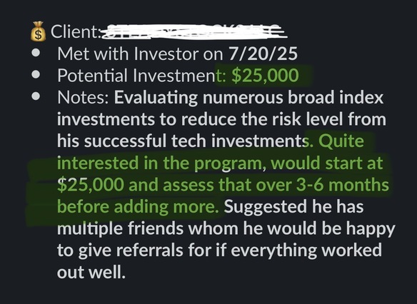 Within 30 days of launch—and on a $300/day ad budget—this group is meeting with 15–20 accredited investors per week. With a $250K minimum, that level of traction built real momentum. It shows what’s possible when message, market, and offer align.