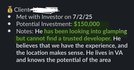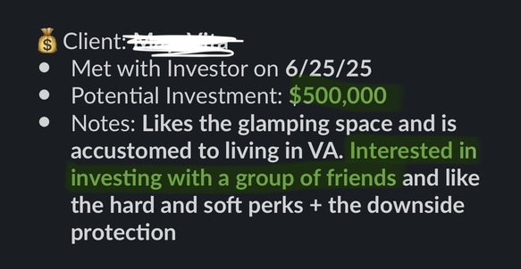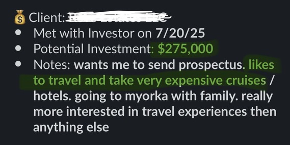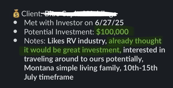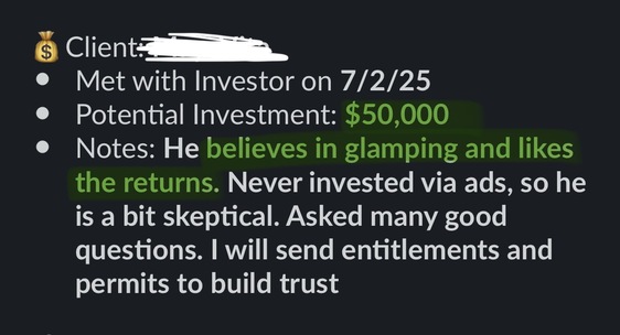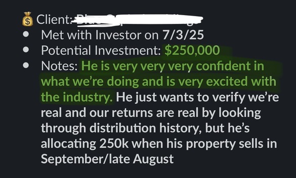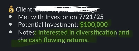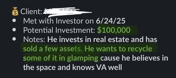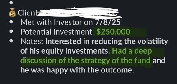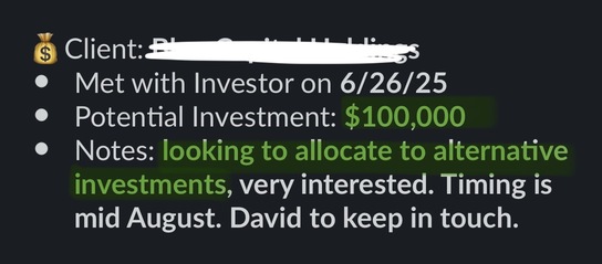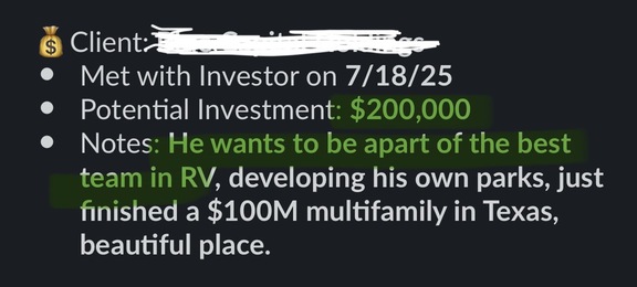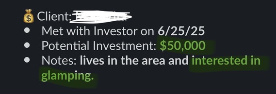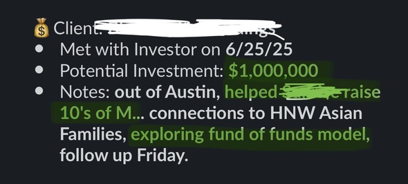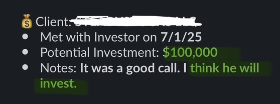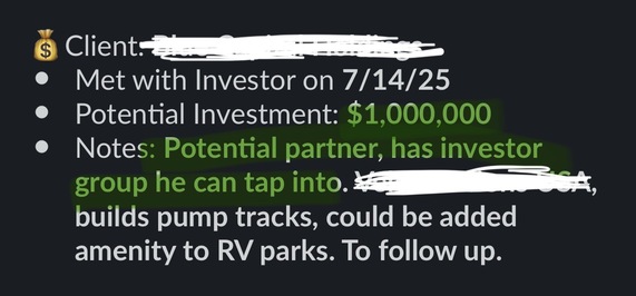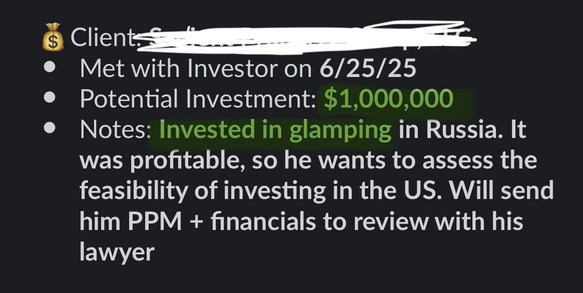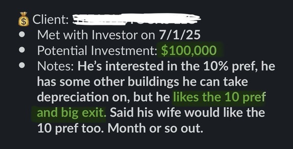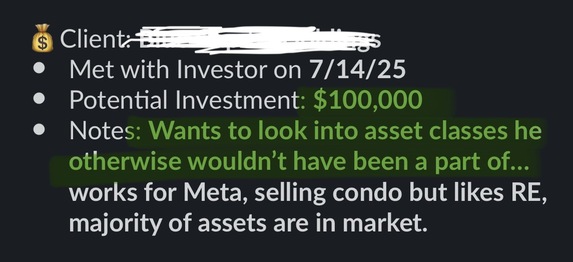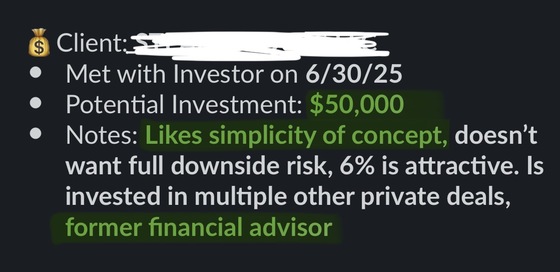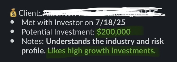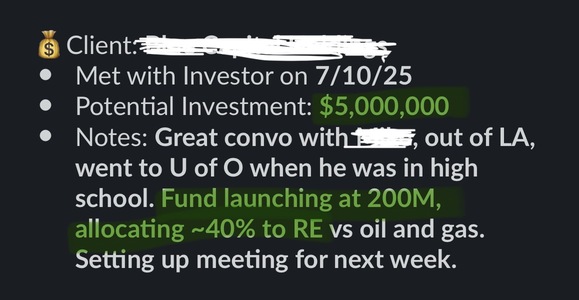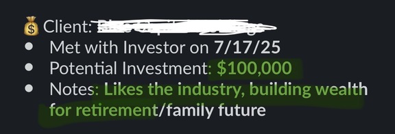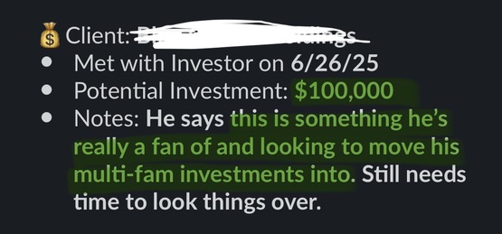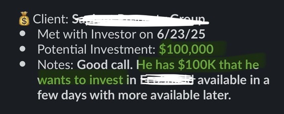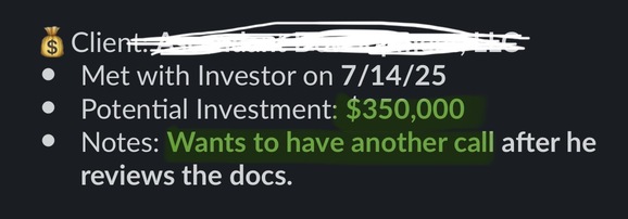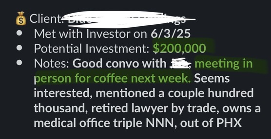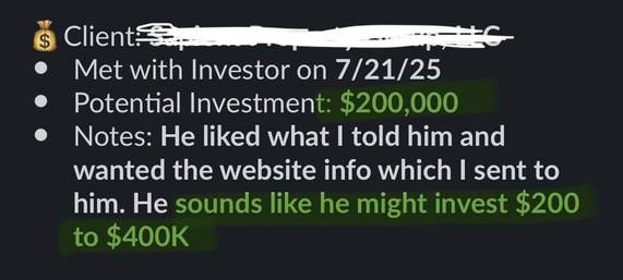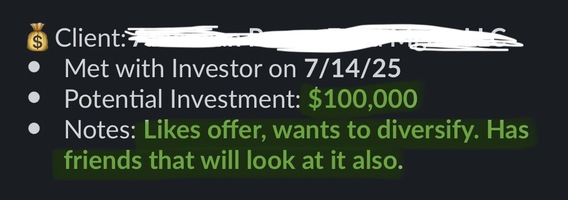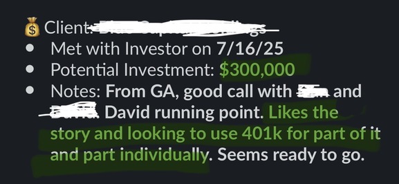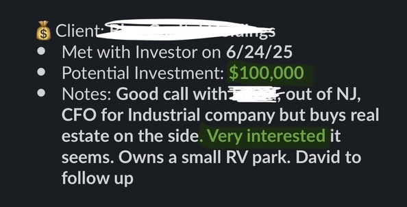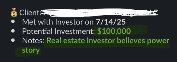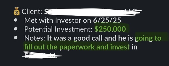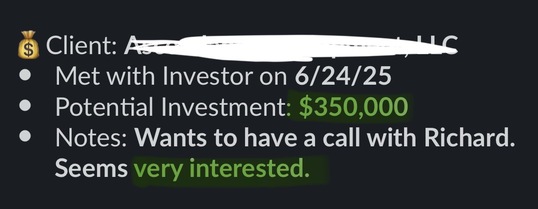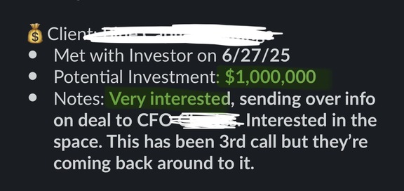 We collect feedback from our clients on every investor meeting. Every conversation here began with a Raise Ready campaign. These are the kinds of meetings our clients are having every week—with real investors, ready to commit.